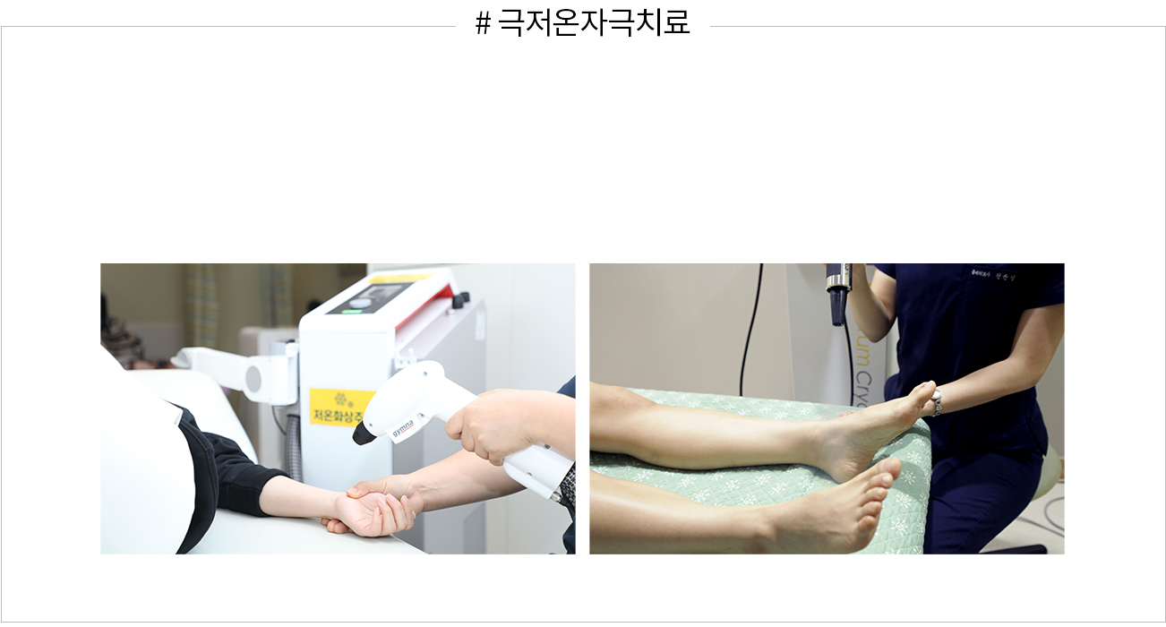 극저온자극치료는 치료부위의 피부 온도를 급속히 냉각시켜 피부 신경 수용체에 자극을 가하여 손상된 조직을 치료하는 방법입니다.